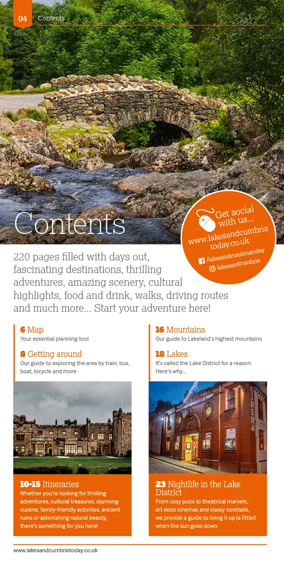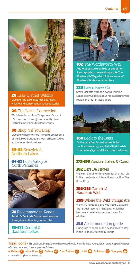 As always, this edition has been updated and refreshed to reflect the best of the Lakes and Cumbria, and you’ll also find special features to help you get to the heart of the region. From cosy pubs to theatrical marvels, art deco cinemas and classy cocktails, we provide a guide to living it up (a little!) when the sun goes down; learn about some of the abundant nature in the region and discover where to find it; we follow the route of Stagecoach’s scenic 555 bus route through some of the Lake District’s most beautiful landscapes; discover where to shop ‘til you drop at some of the Lakes’ boutique shops, artisan studios and independent makers; Penrith’s Beckside Books provide some literary inspiration for your next trip; author Jade Cookson tells us about her literary guide to new walking route The Wordsworth Way, which follows some of Wordsworth’s favourite rambles; Steve Ricketts from the award-winning Lakes Brew Co talks about his passion for the region and his fantastic beers; as the Lake District welcomes its first public observatory, we chat with Grizedale Observatory’s James Fildes to find out more; we learn about Whitehaven’s fascinating role in the rum trade at interactive attraction The Rum Story; and we visit the rugged and wild RSPB Geltsdale, the largest reserve in England, which has become a quietly impressive haven for wildlife.